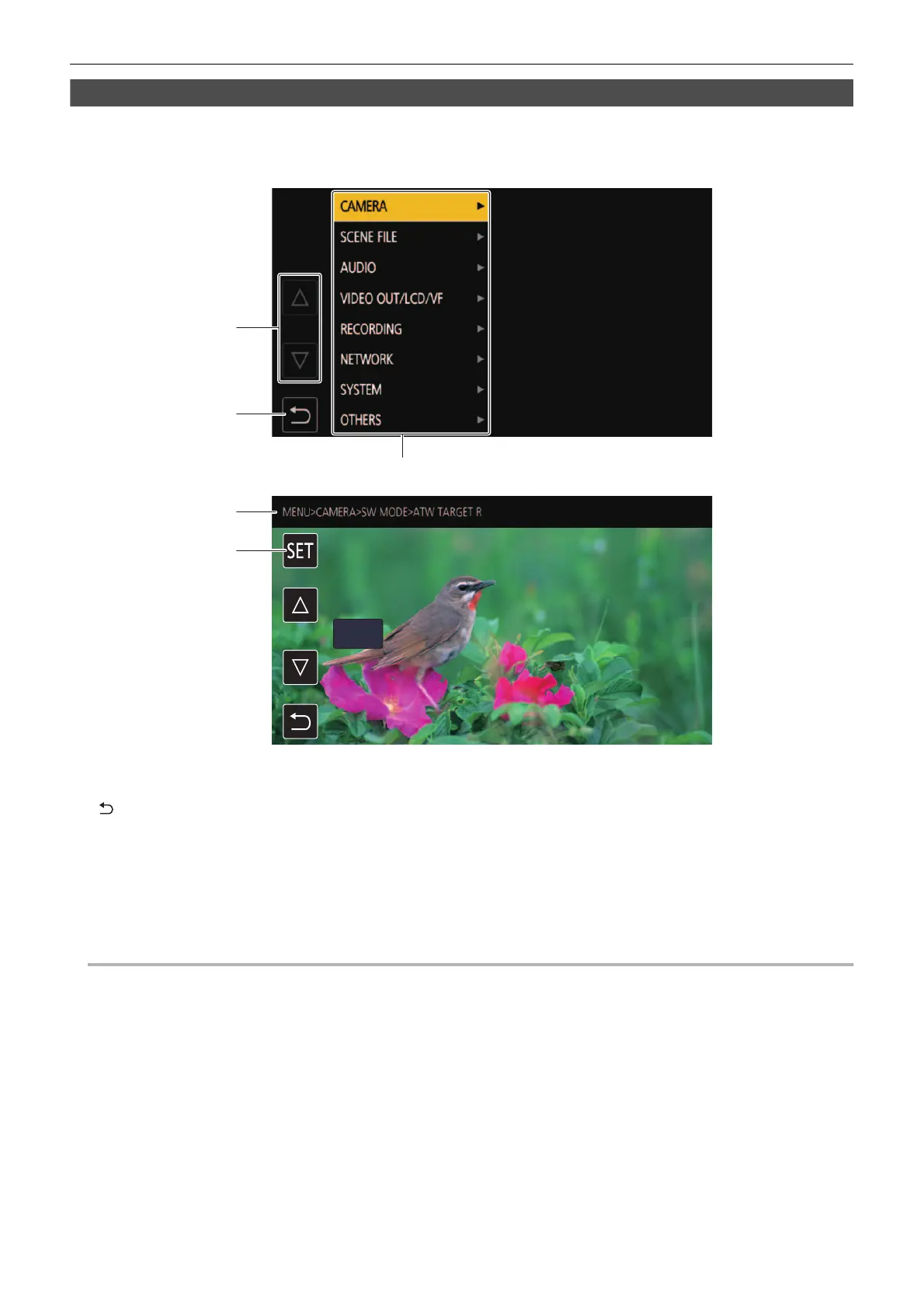 Moves to one level lower from the current menu, or to the setting screen when selected.