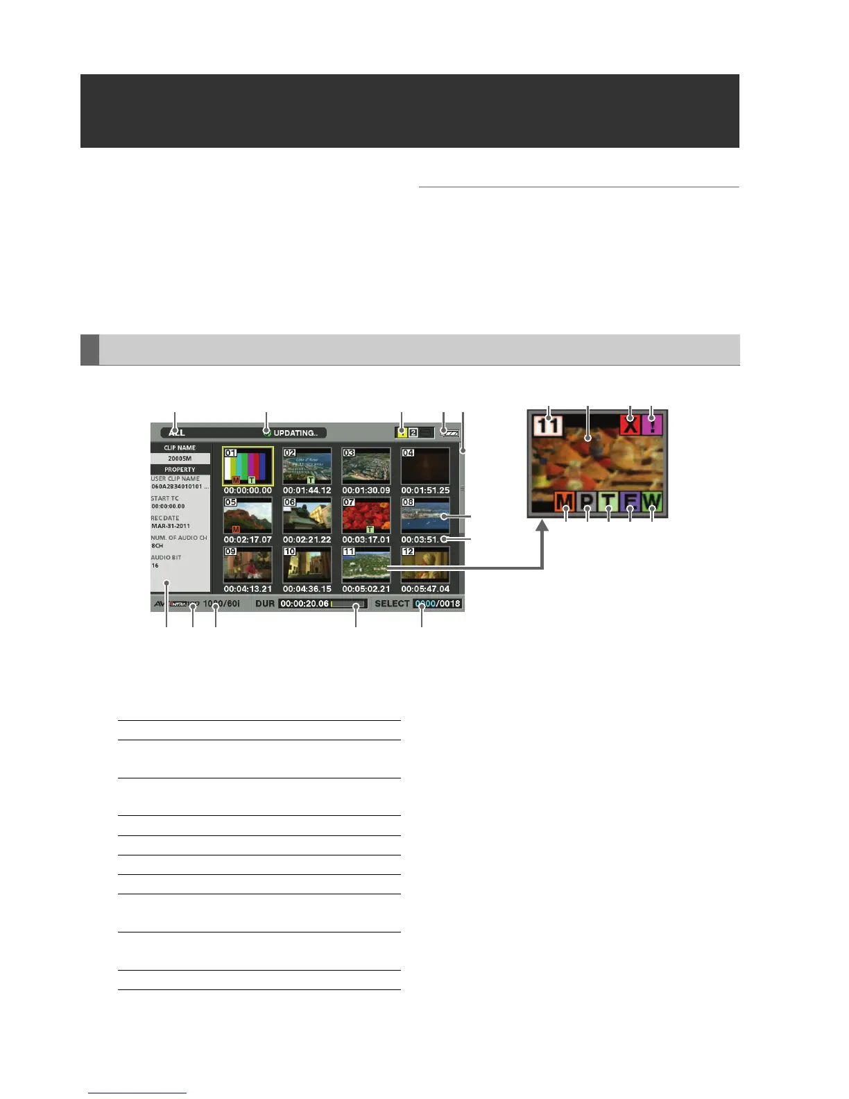 • Displays clip thumbnails, information, P2 card status and