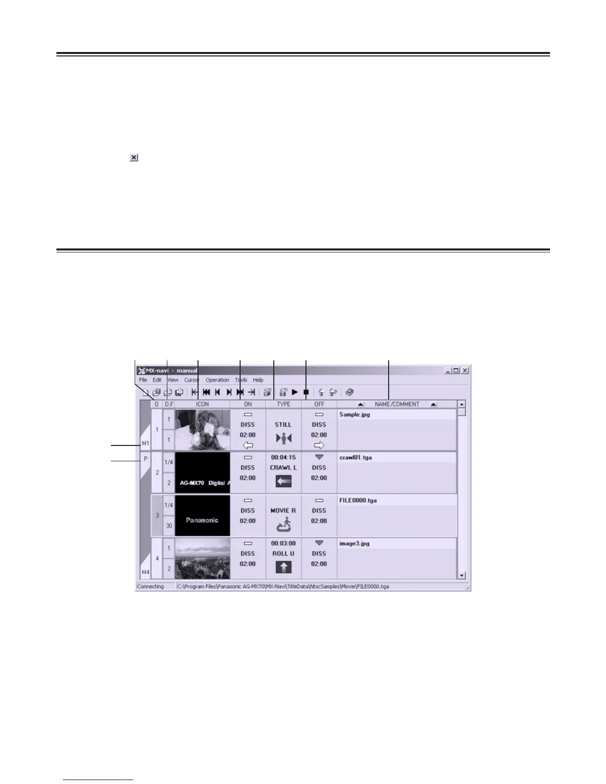 A list of Title data, called the transmission list, is displayed on the main window. The main window of MX-Navi has two
