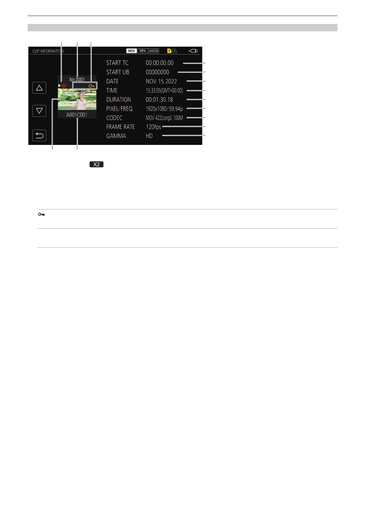 • Displays when the variable frame rate recording function is enabled and the clip is recorded in a frame rate different from