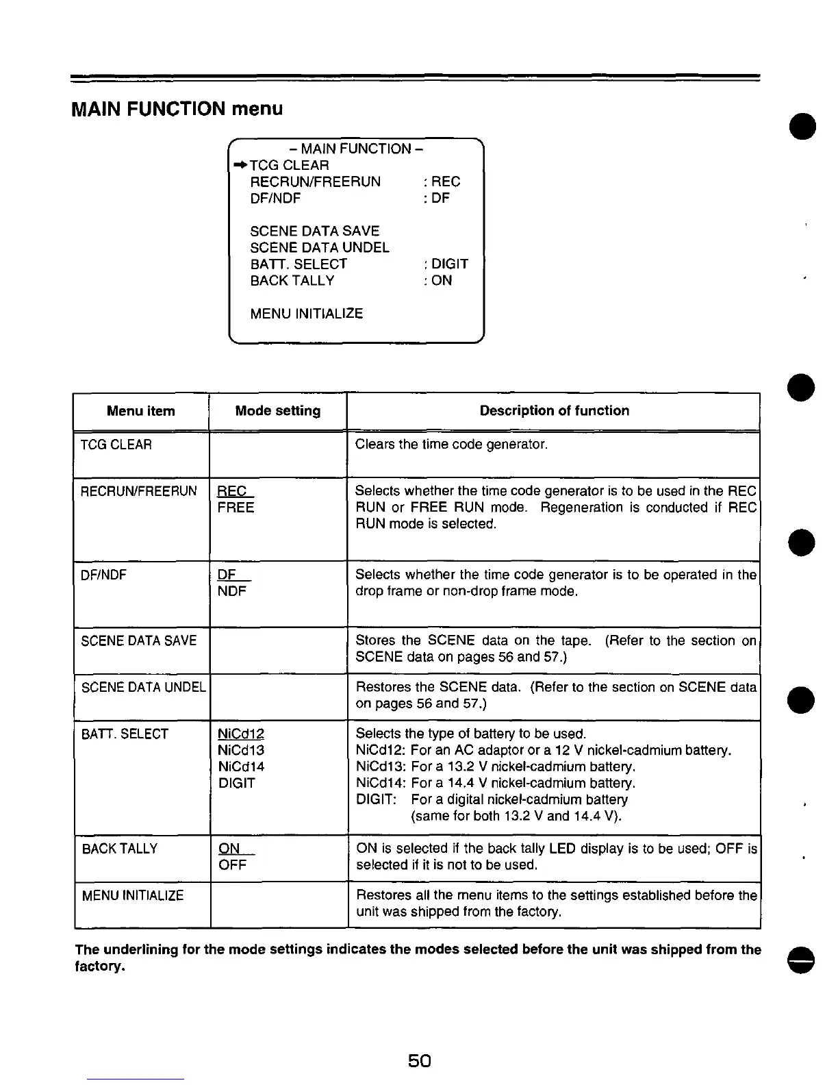 Panasonic AJ-D200 - MAIN FUNCTION Menu Details