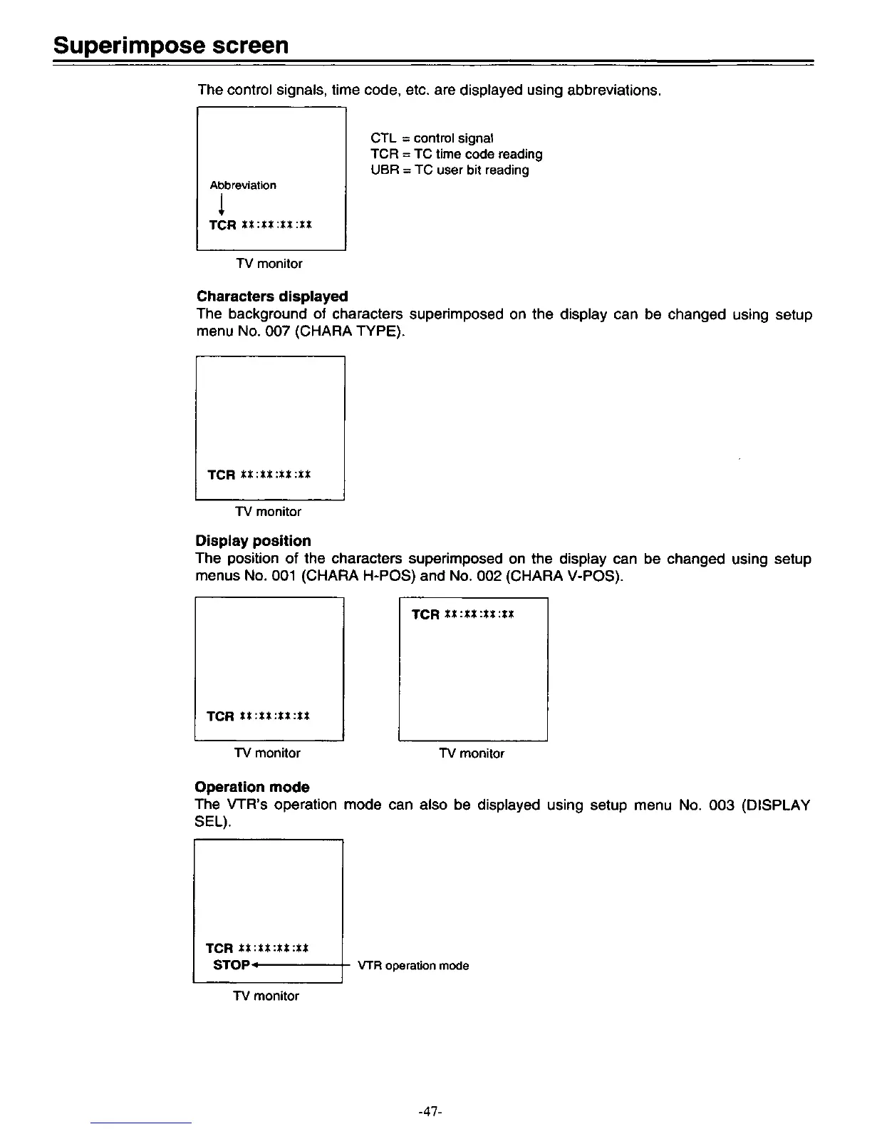 Panasonic AJ-D450 - Superimpose Screen Information; Display Abbreviations and Characters; Display Position and Operation Mode