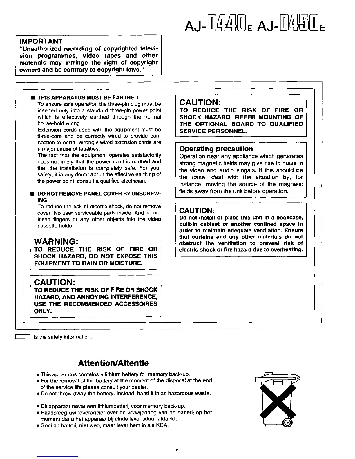 Panasonic AJ-D450 - Additional Safety and Operational Notes; Apparatus Earthing and Panel Safety; Operating Precautions and Battery
