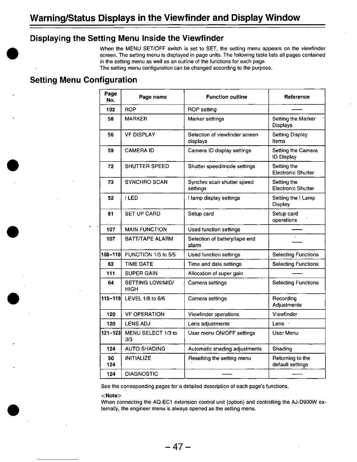 Panasonic AJ-D900 - Viewfinder, Display, and Setting Menus; Viewfinder and Display Information