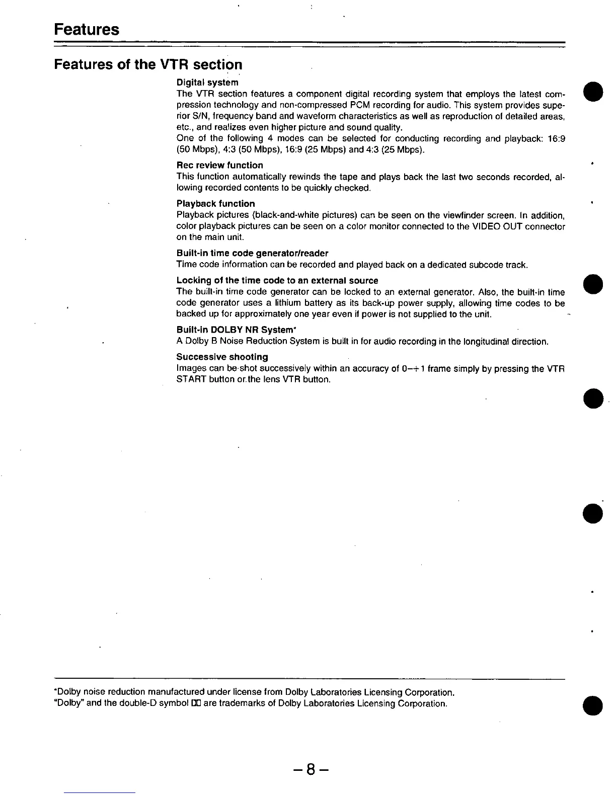 Panasonic AJ-D900 - VTR Section Features