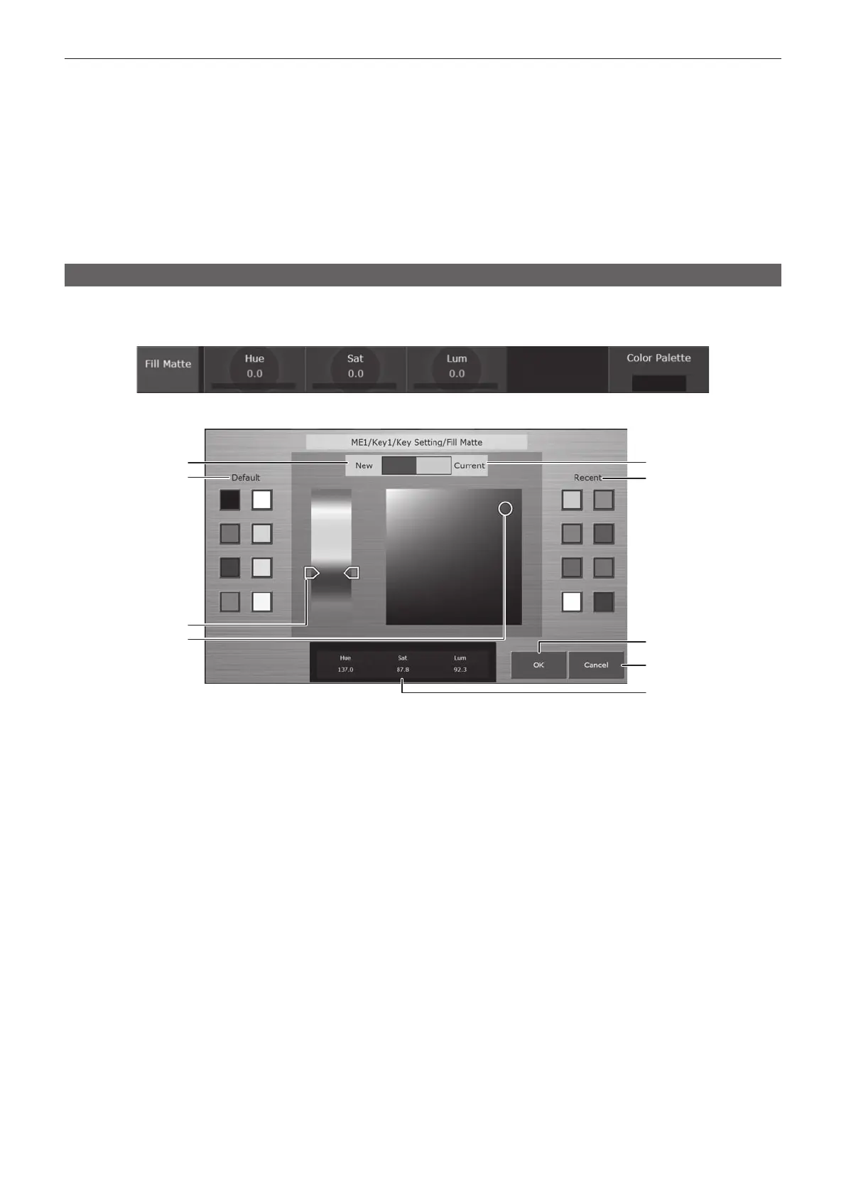 f Directly enter numeric values into each item for [Hue], [Sat], and [Lum]. (page 32)