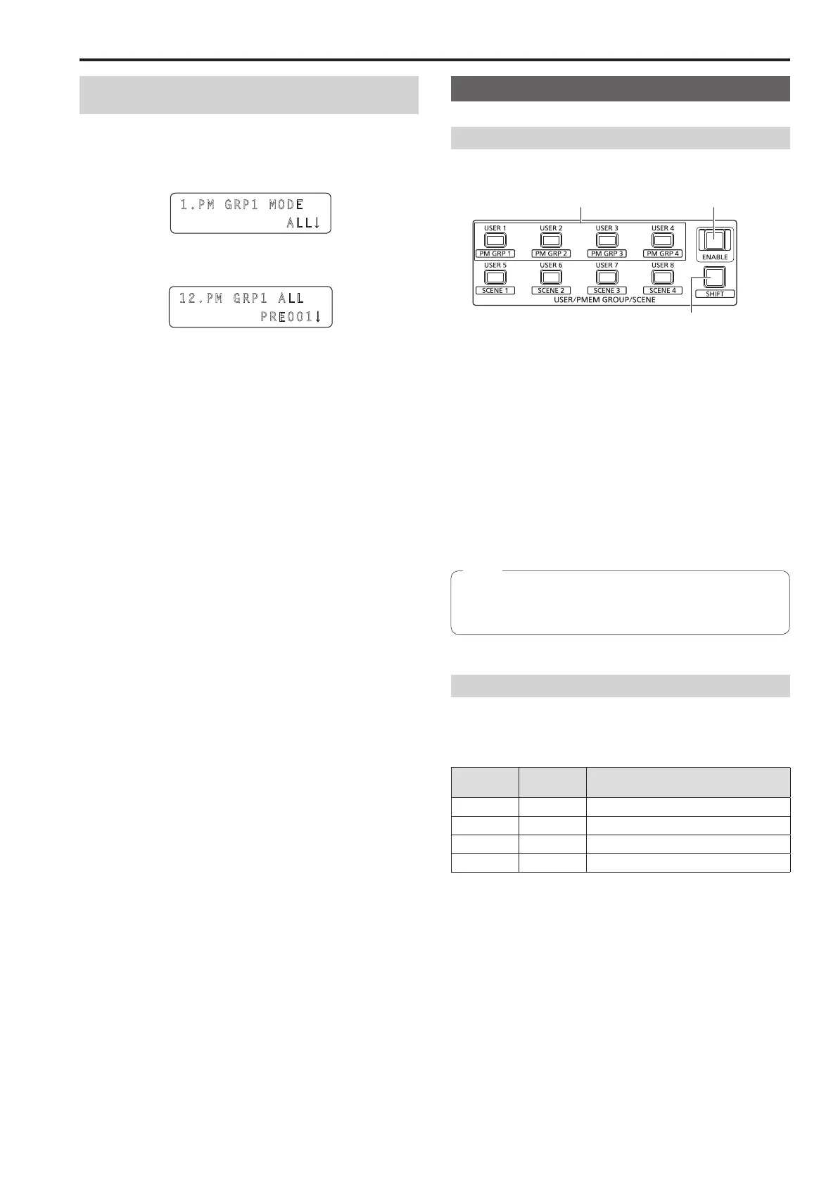 PM GRP 1 to PM GRP 4 buttons USER ENABLE button