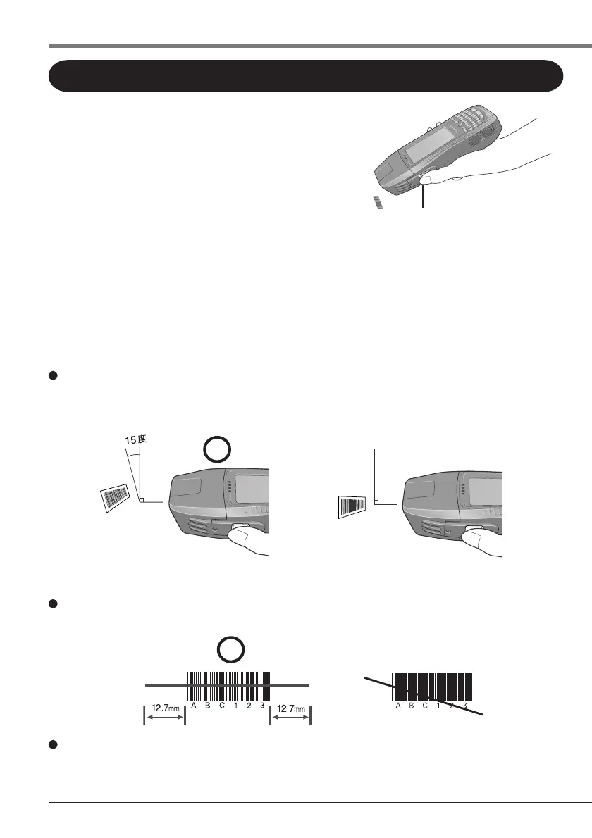 読み取れない場合があります。図のような角度(直角+ 15 度)で読み取ってくださ