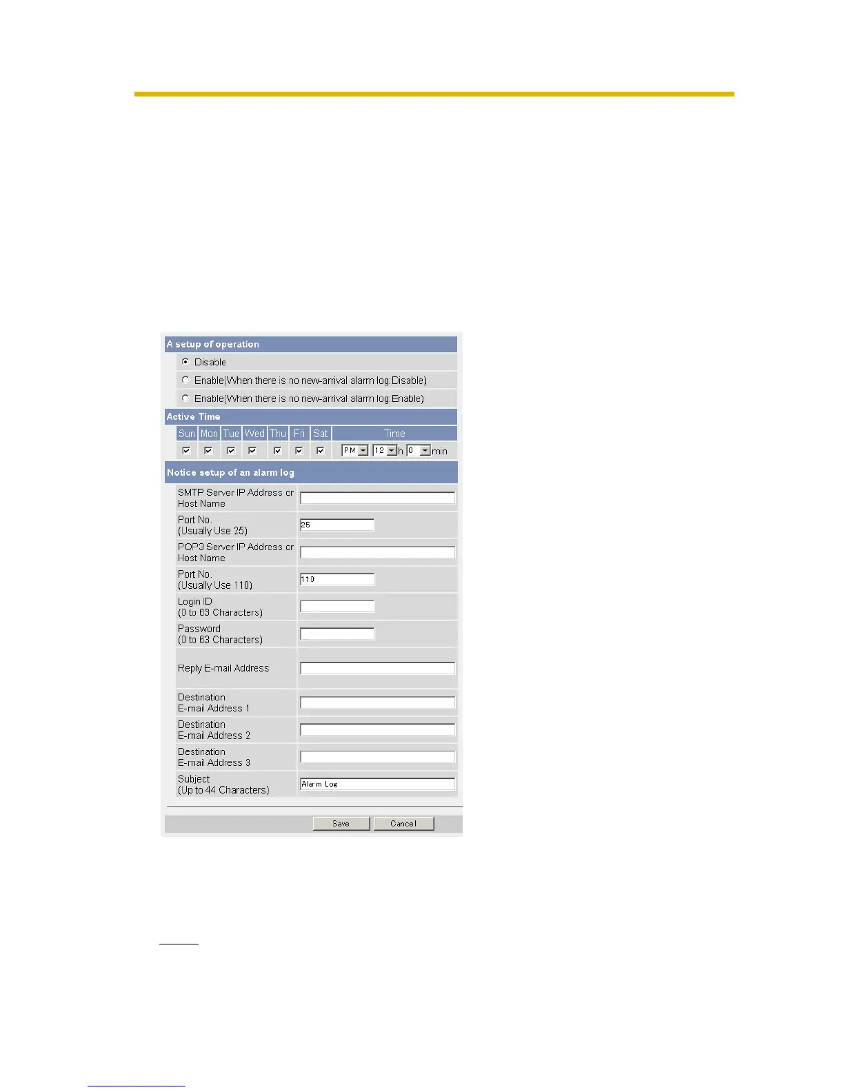 Once a day, an alarm log sent at a specified time can be checked. To enable Alarm Log,