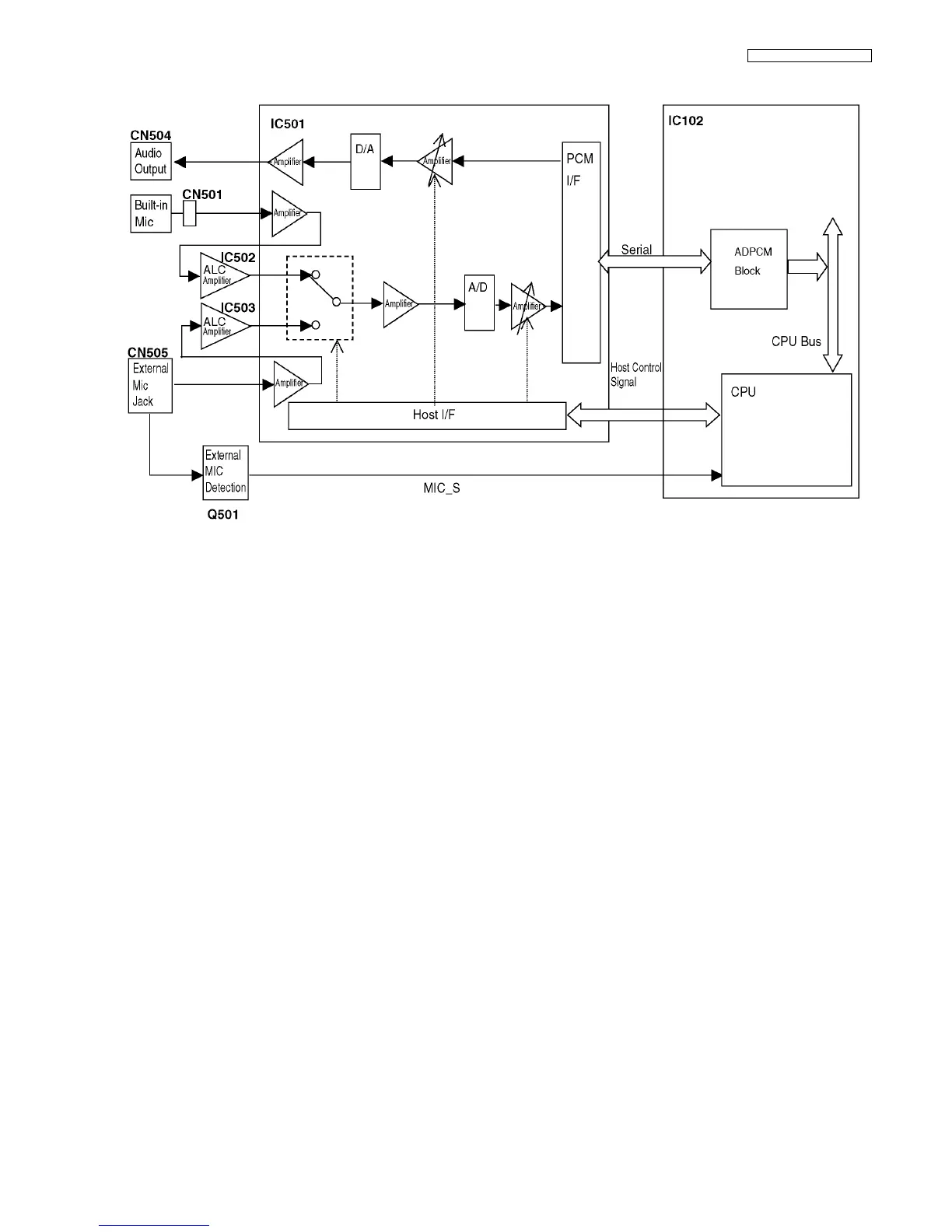 1. The audio signal input from pin 1 of the built-in microphone connector (CN501) is amplified by the amplifier in the PCM Codec