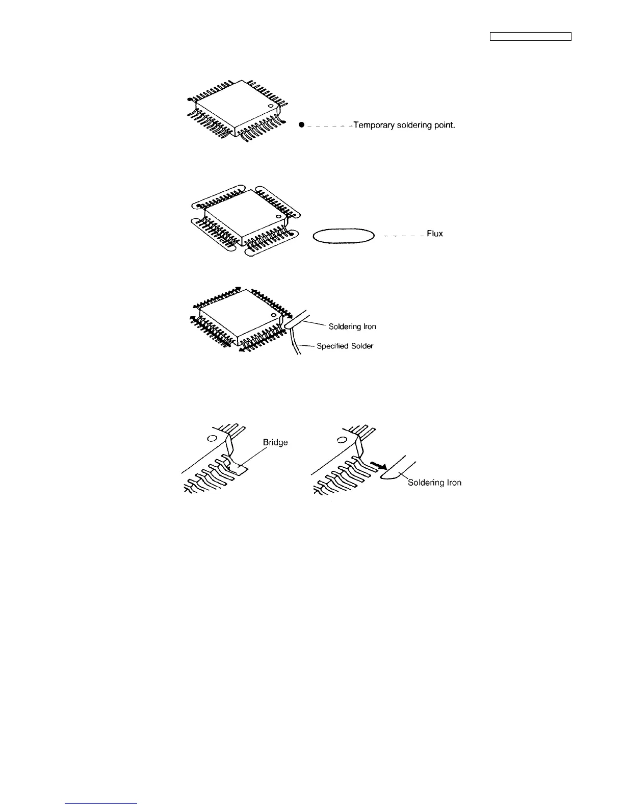 1. Temporarily fix the FLAT PACKAGE IC, soldering the two marked pins.