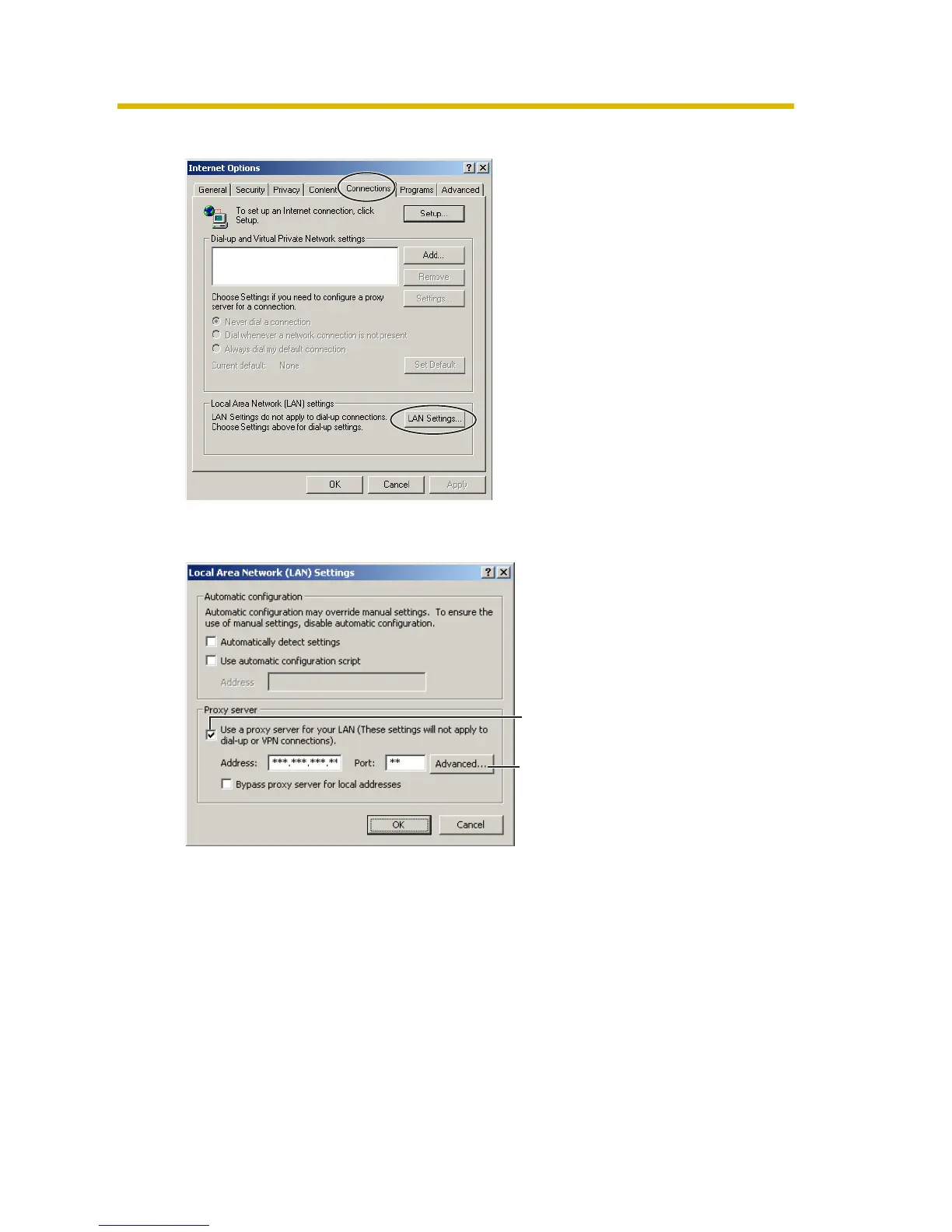 3. Click the [Connections] tab, and click [LAN Settings].