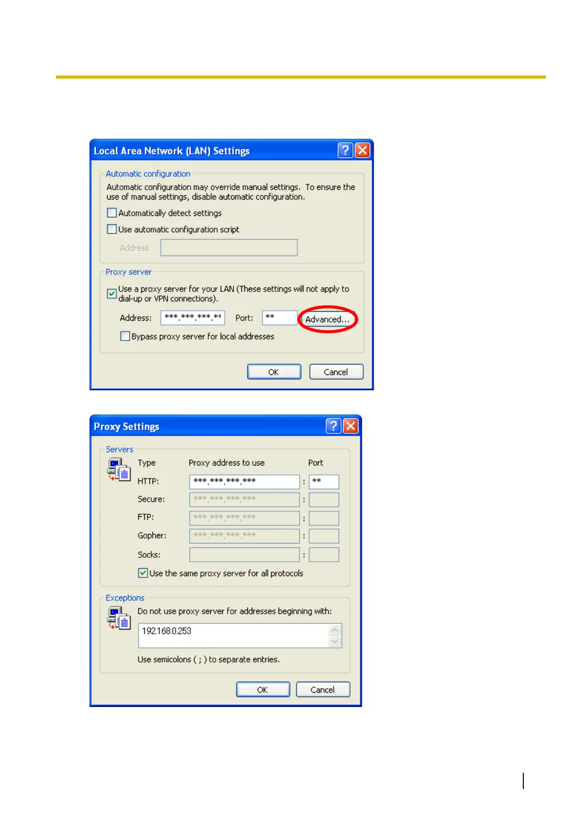 5. Enter the camera’s IP address in the field under [Do not use proxy server for addresses beginning with:].