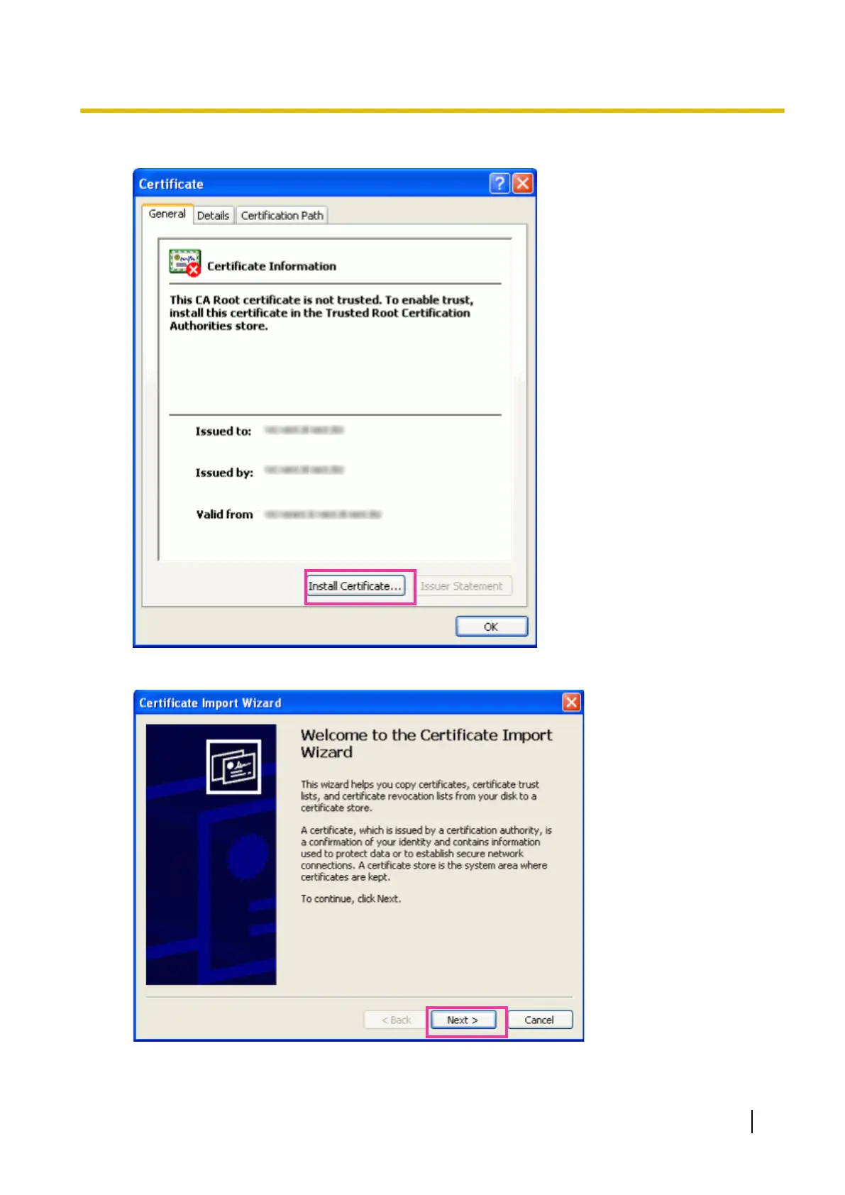 4. Click “Next >” according to the procedures displayed on the displayed on “Certificate Import Wizard”.