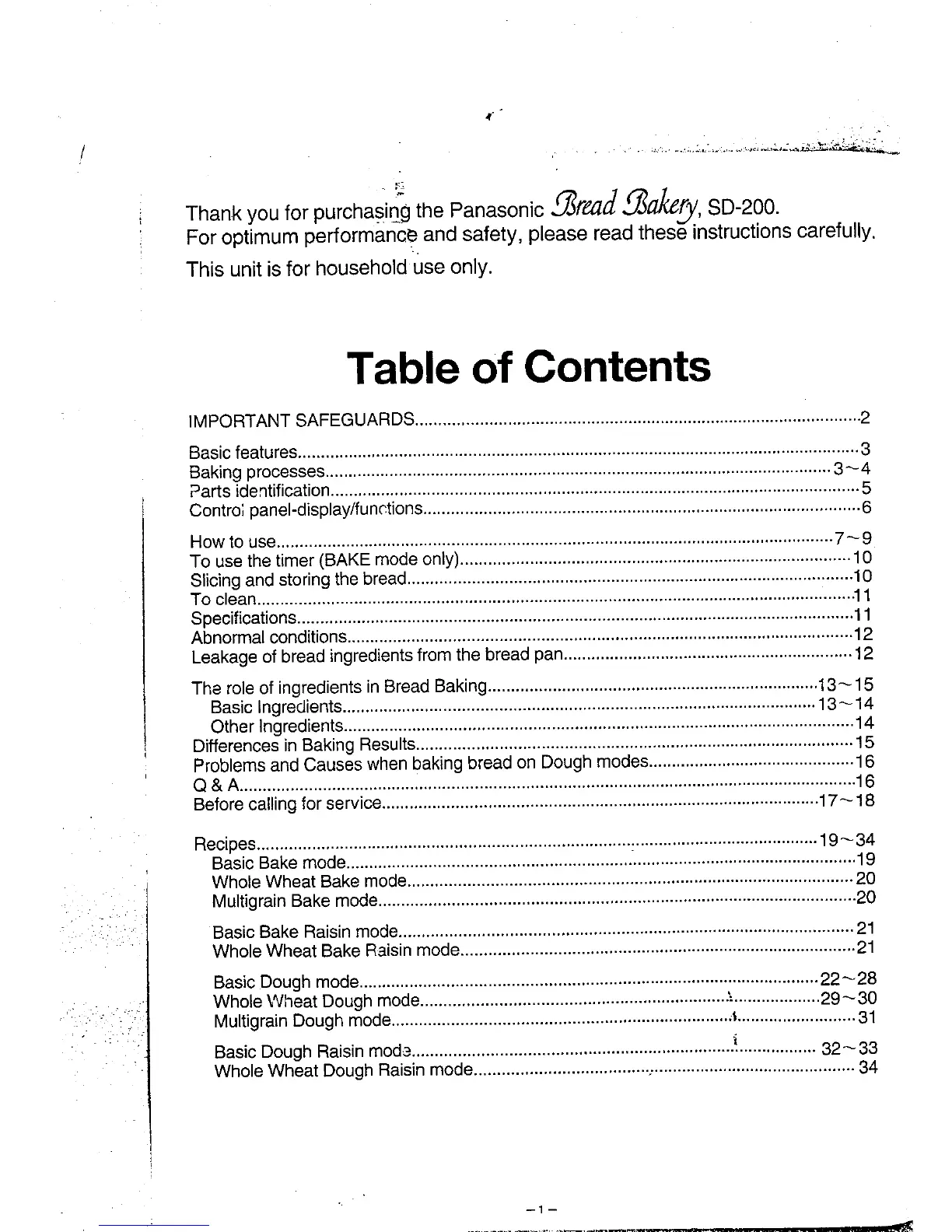 Panasonic Bread Bakery SD-200 - Table of Contents
