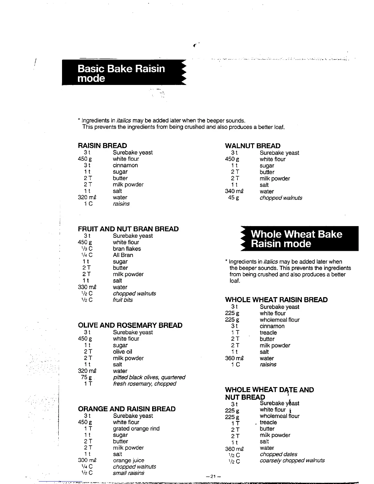 Panasonic Bread Bakery SD-200 - Basic Bake Raisin Mode; Whole Wheat Bake Raisin Mode