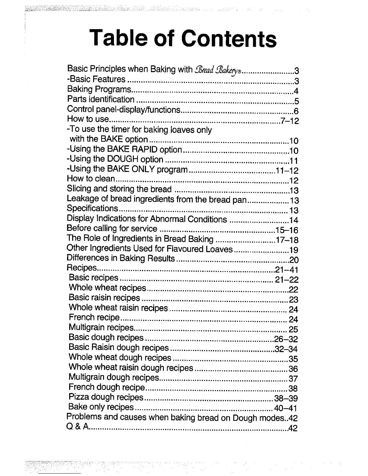Panasonic Bread Bakery SD-251 - Table of Contents