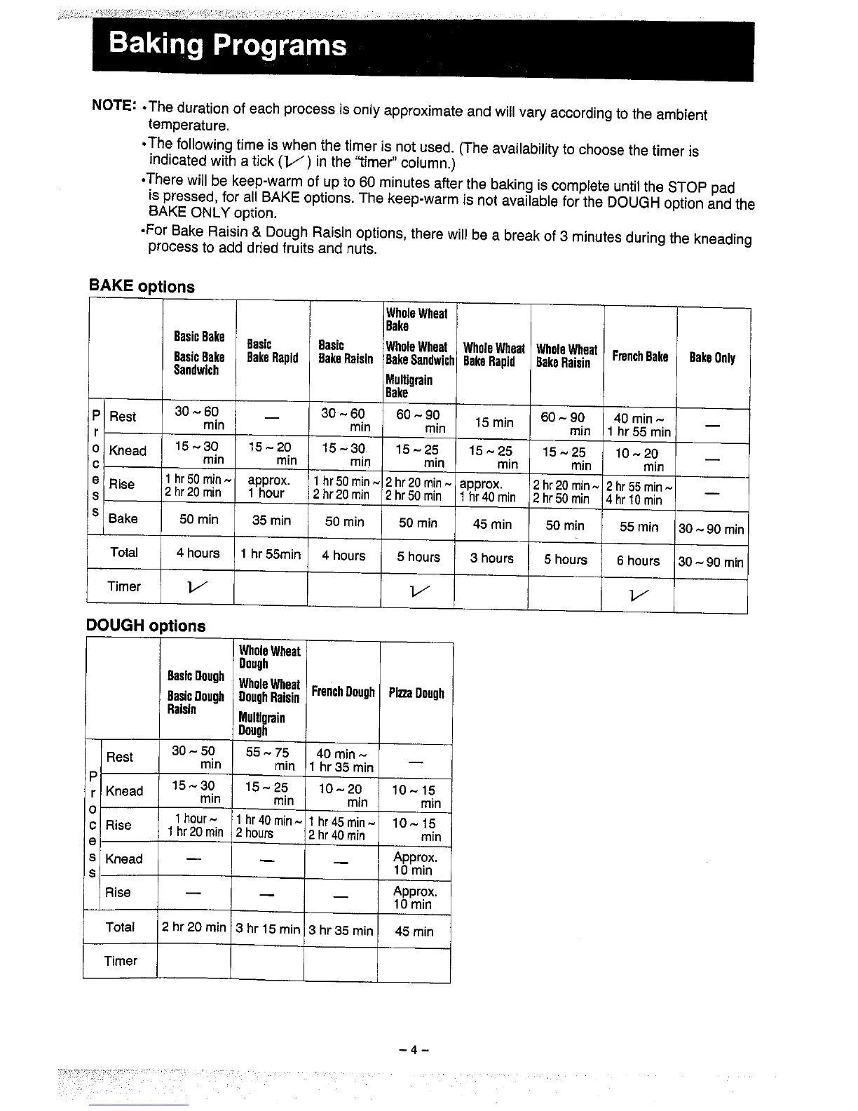 Panasonic Bread Bakery SD-251 - Baking Program Details; BAKE and DOUGH Options Timing
