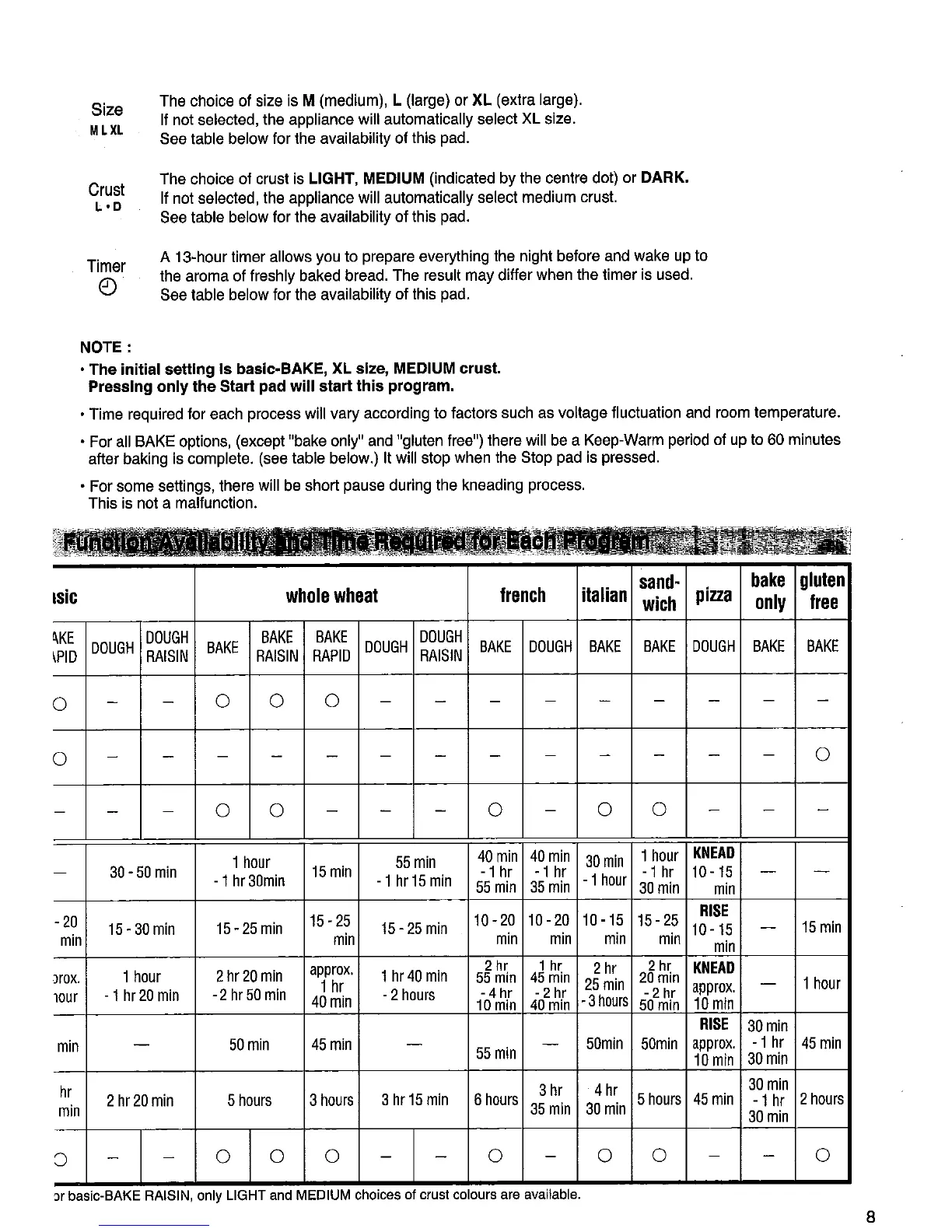Panasonic Bread Bakery SD-253 - Basic Features; Program Functionality and Time