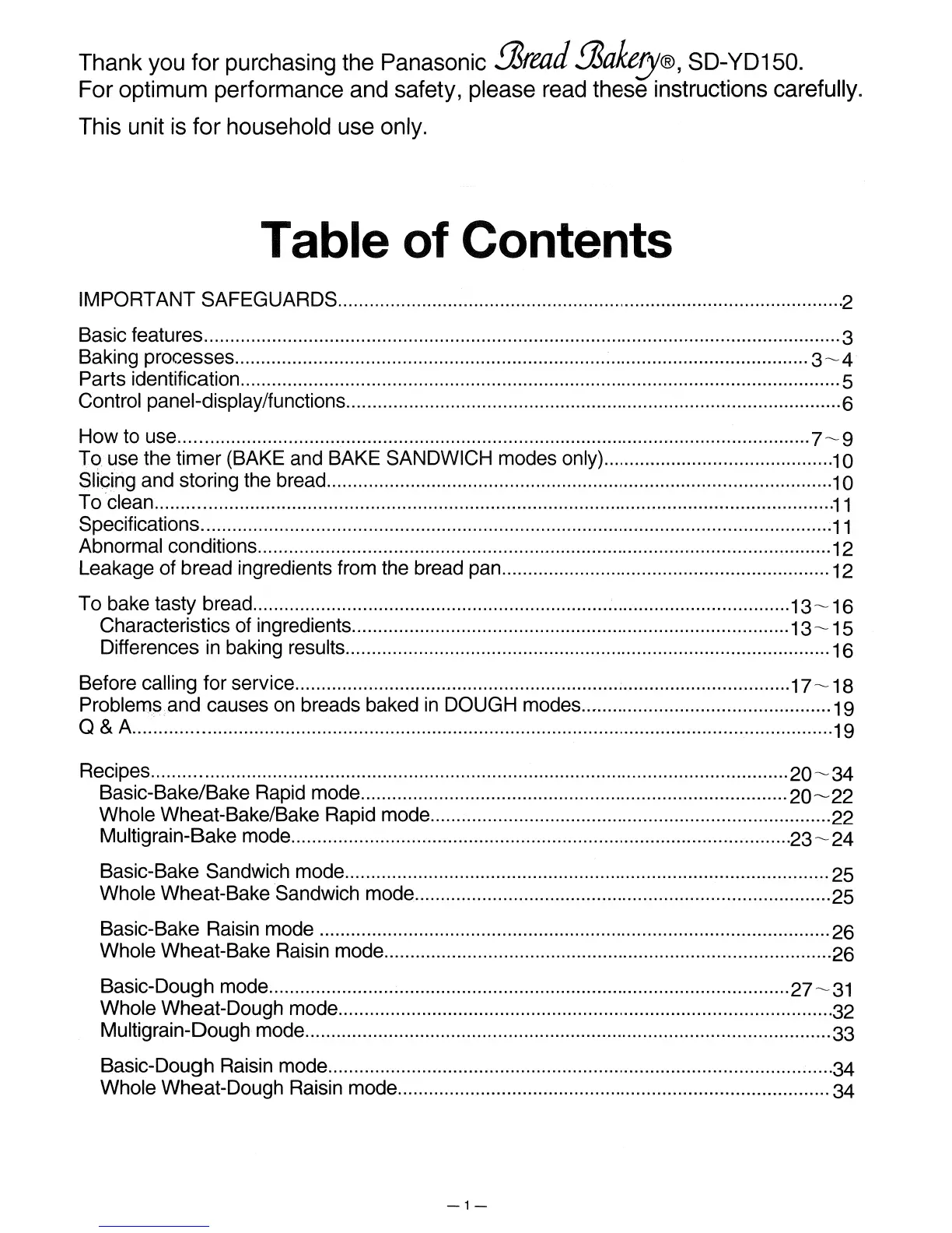 Panasonic Bread Bakery SD-YD150 - Table of Contents