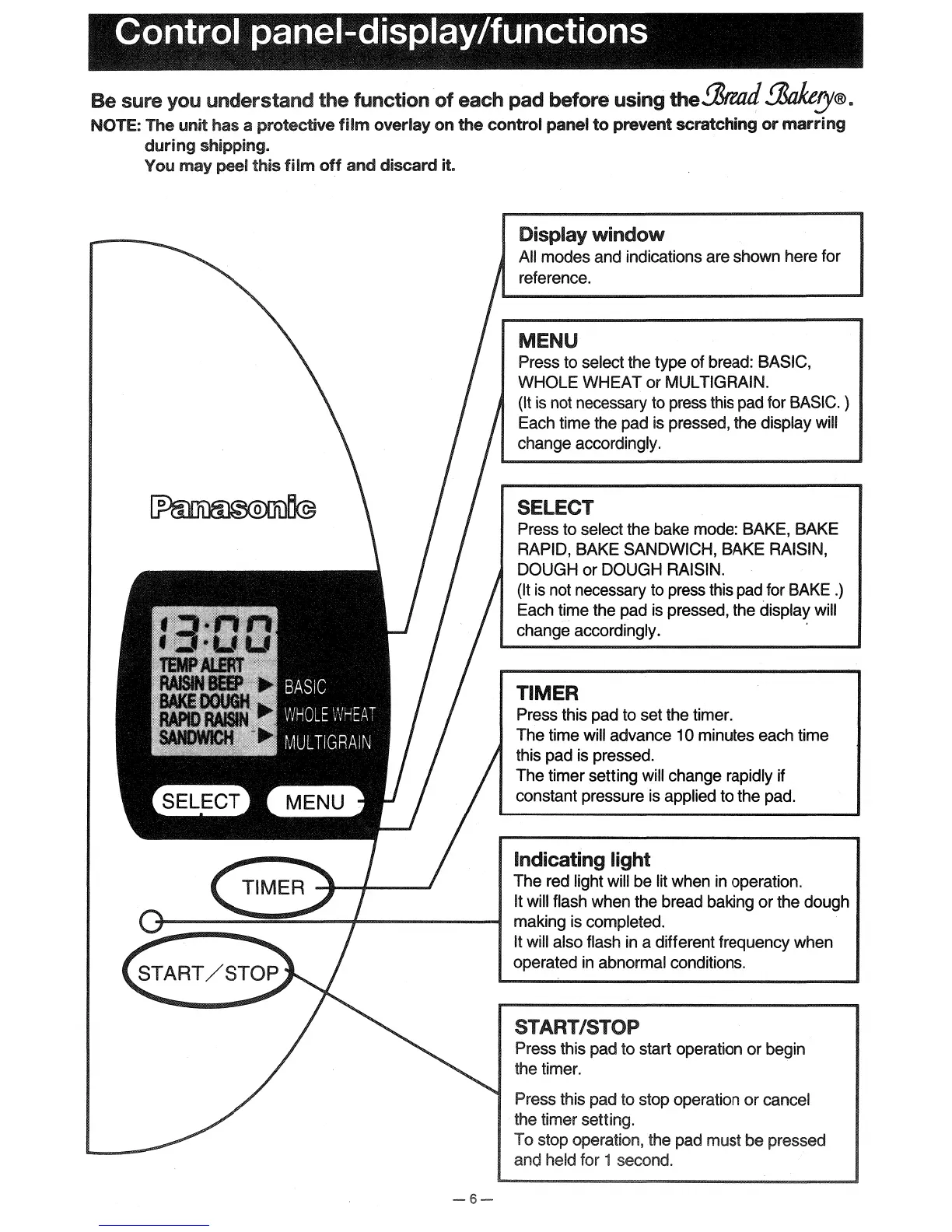 Panasonic Bread Bakery SD-YD150 - Control panel-display;functions; Control Panel Features