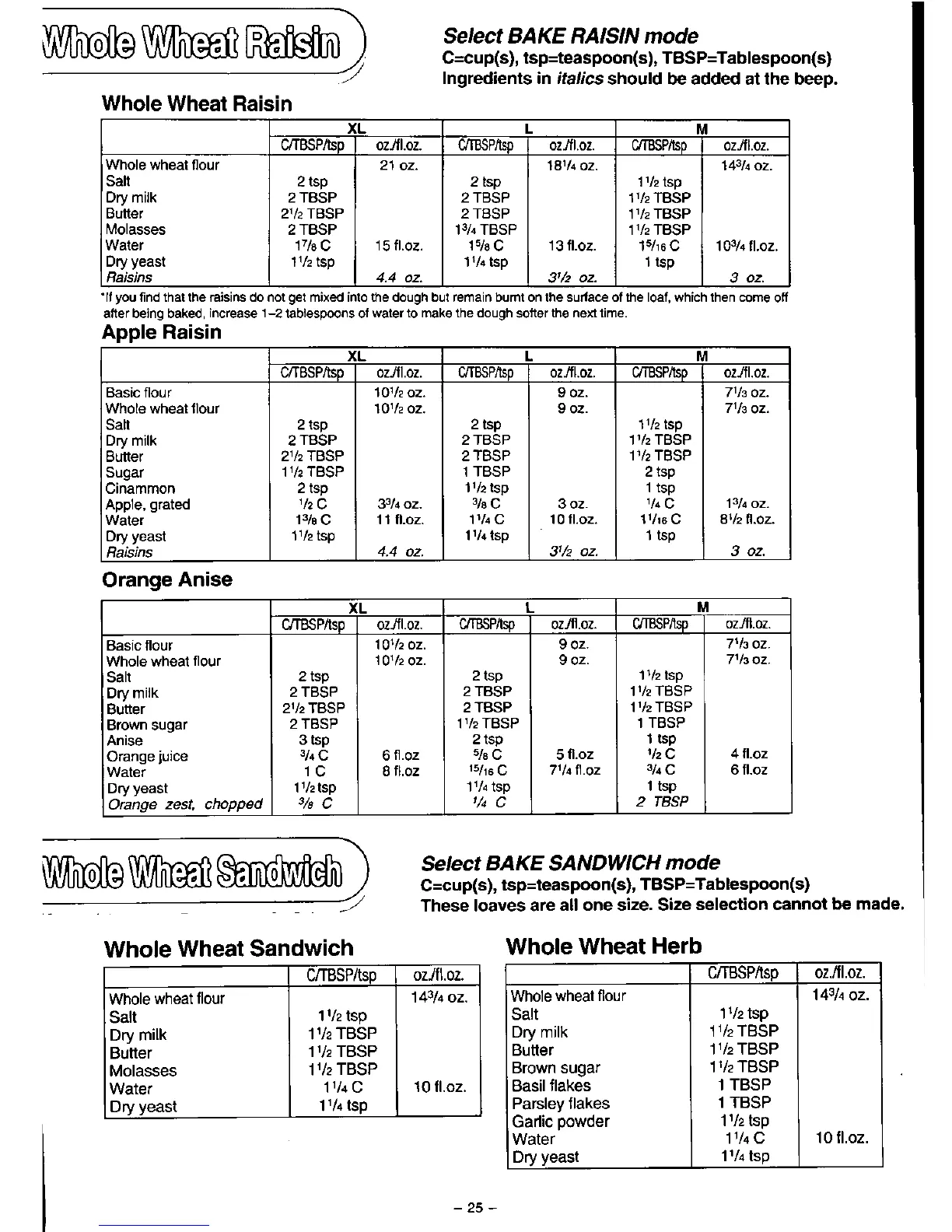 Panasonic Bread Bakery SD-YD250 - Whole Wheat Sandwich; Whole Wheat Raisin; Apple Raisin; Orange Anise