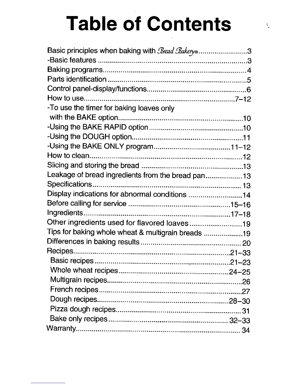 Panasonic Bread Bakery SD-YD250 - Table of Contents