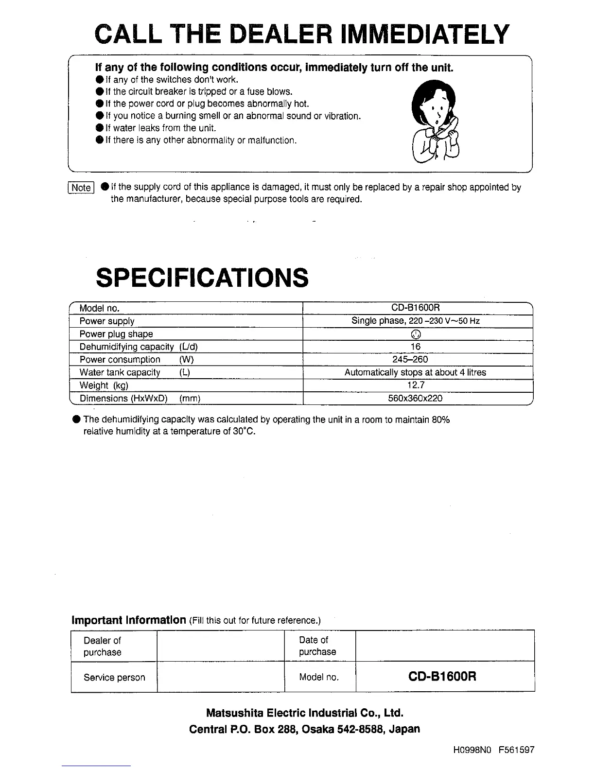 Panasonic CD-B1600R - Dealer Contact Information; Conditions Requiring Immediate Action