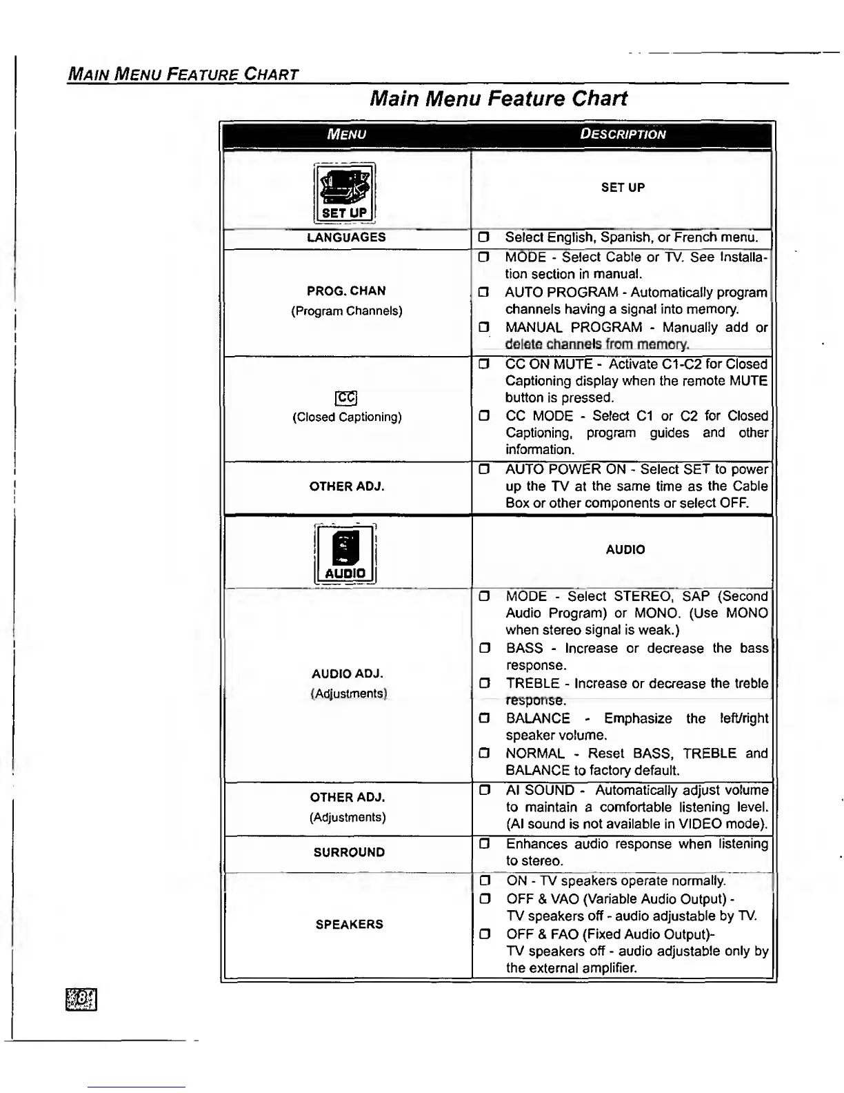 Panasonic ceCT-27D10 - Main Menu Feature Chart