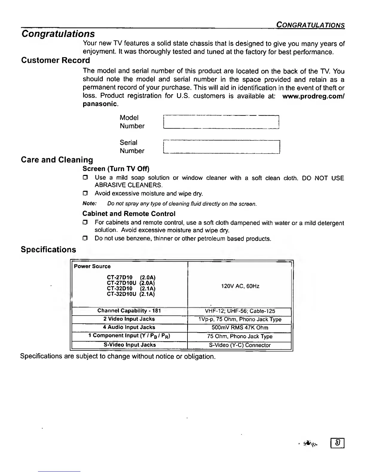 Panasonic ceCT-27D10 - Congratulations; Customer Record; Care and Cleaning; Specifications