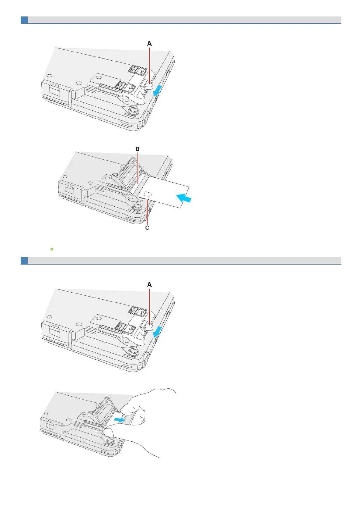 2. Insert the Smart Card to the slot (B) with the contact part (C) on the back.