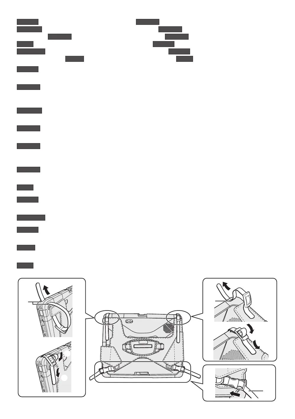 (C, D) Pass the end of the strap through the strap holes (B) on the tablet, and attach it as shown in the figures
