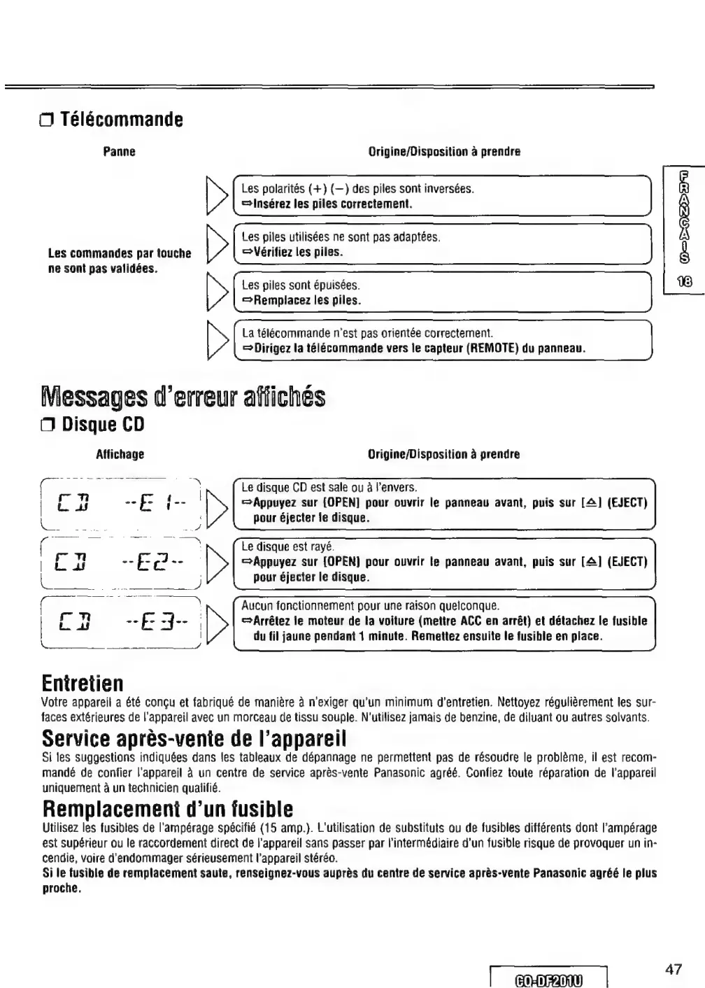 Panasonic CQ-DF201U - Messages Derreur Affichés; Entretien