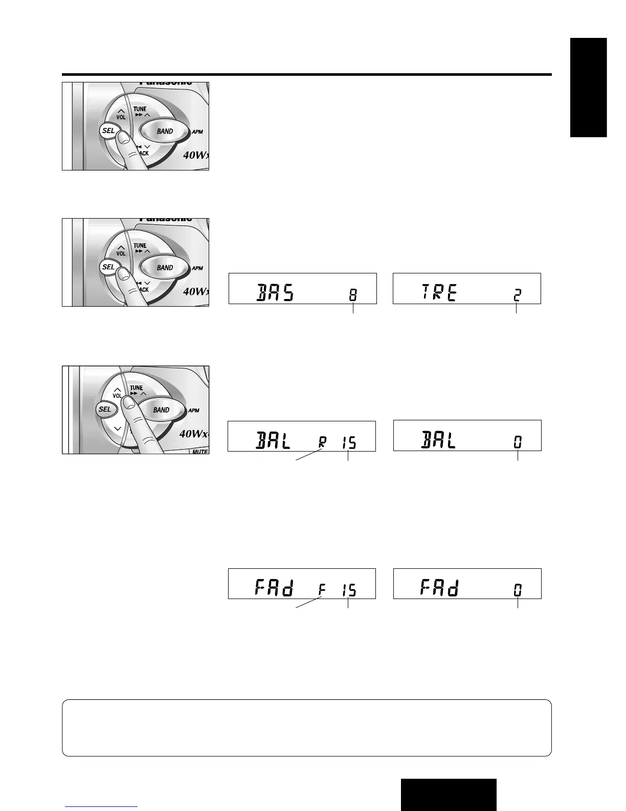 Note: When a control mode (BAS/TRE/BAL/FAd) is selected but no operation is made within 5