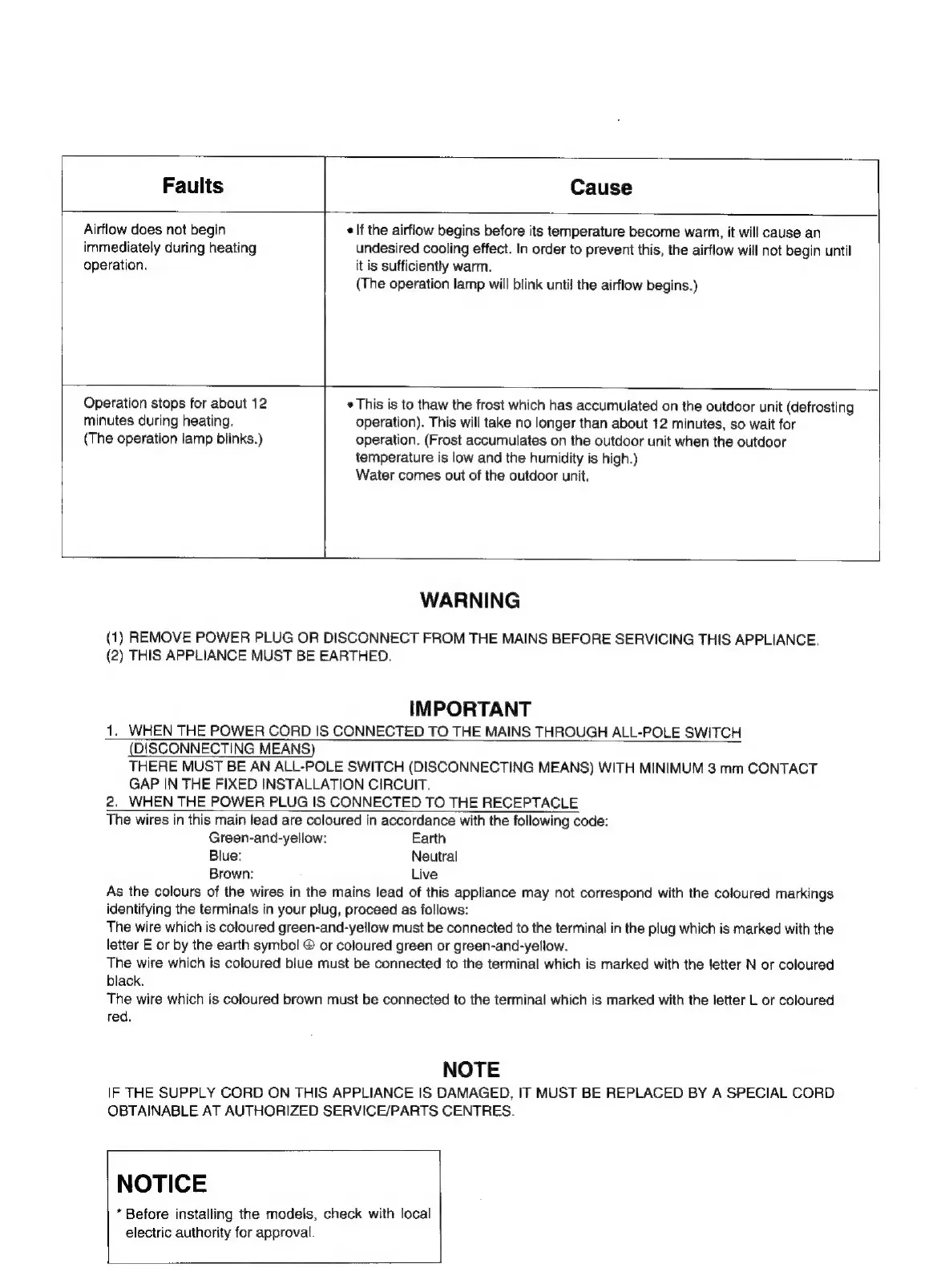 Panasonic CS-2473KR - 20. Troubleshooting and Warnings; Common Faults, Causes, and Safety Notices