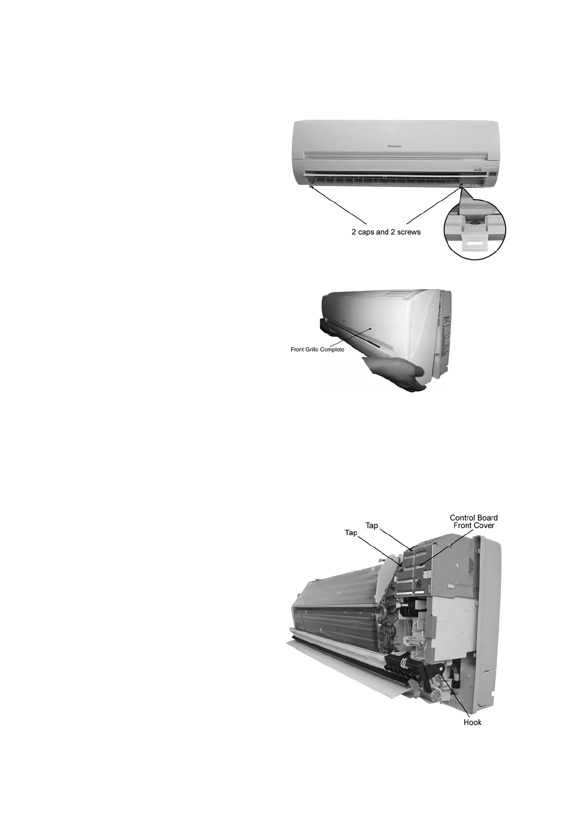• Remove the 2 caps and 2 screws at the bottom of the Front