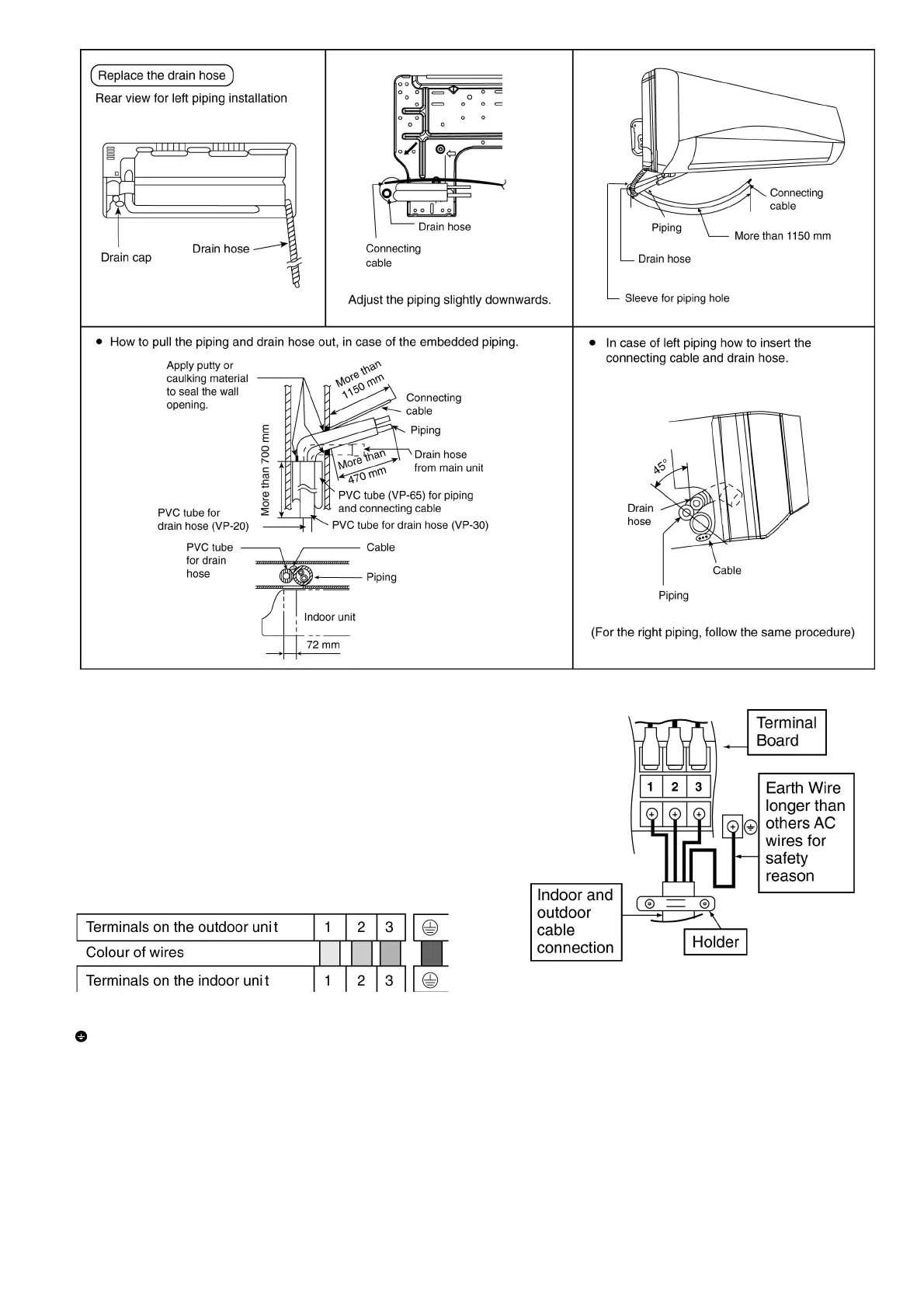 • Ensure the colour of wires of outdoor unit and the terminal Nos. are the same to the indoor’s respectively.