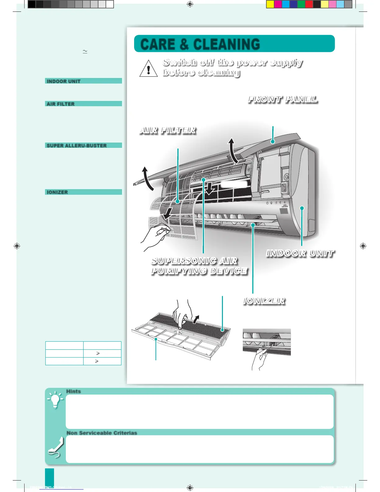 Panasonic CS-E12DKRW - Care and Cleaning; Indoor Unit and Air Filter Cleaning; Super Alleru-Buster and Ionizer Cleaning; Preparation for Non-operation and Inspection