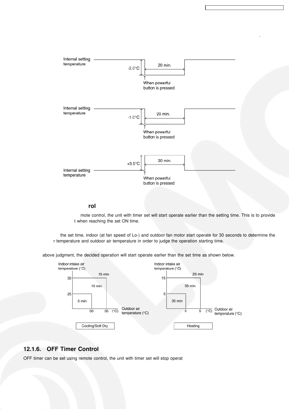 60 minutes before the set time, indoor (at fan speed of Lo-) and outdoor fan motor start operate for 30 seconds to determine the