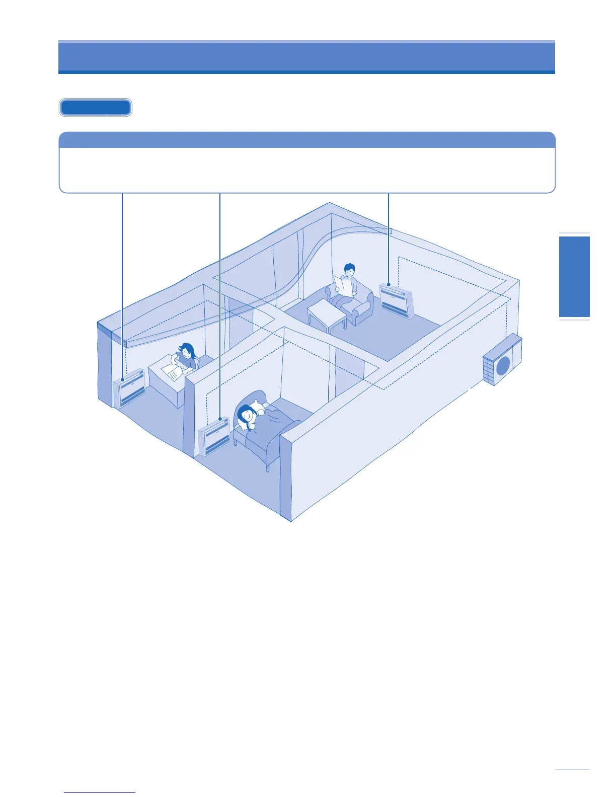 Multiklimaanleggsystem har en utendørsenhet koblet til fl ere innendørsenheter.