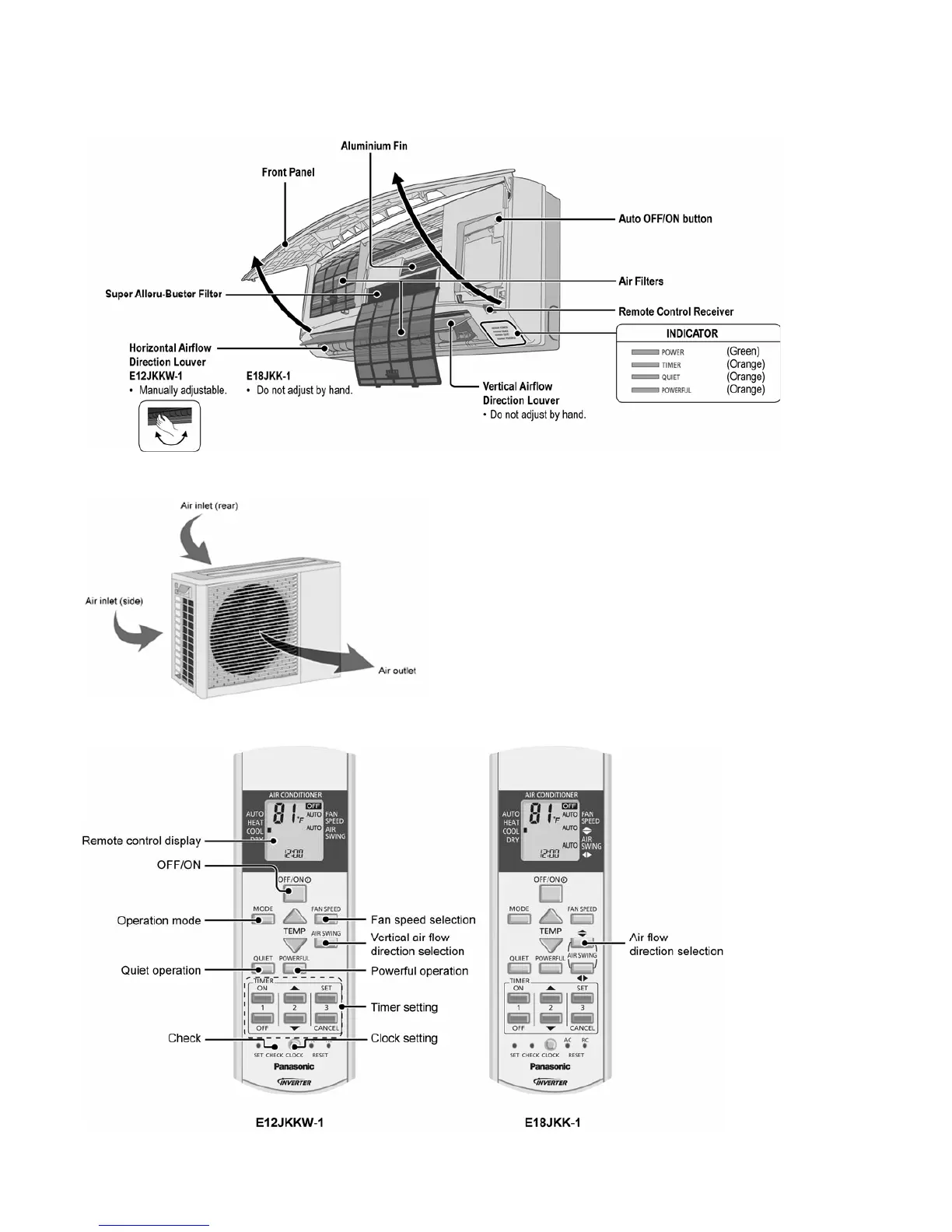 Panasonic CS-E12JKKW-1 - Location of Controls and Components; Indoor Unit; Outdoor Unit; Remote Control