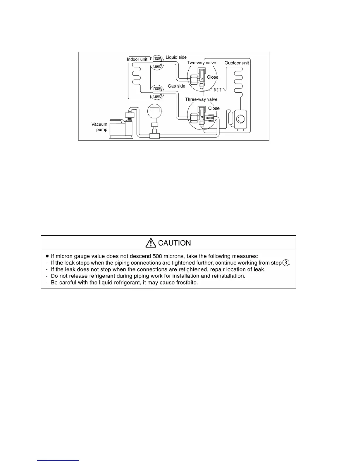 2. Connect the micron gauge between vacuum pump and service port of outdoor units.