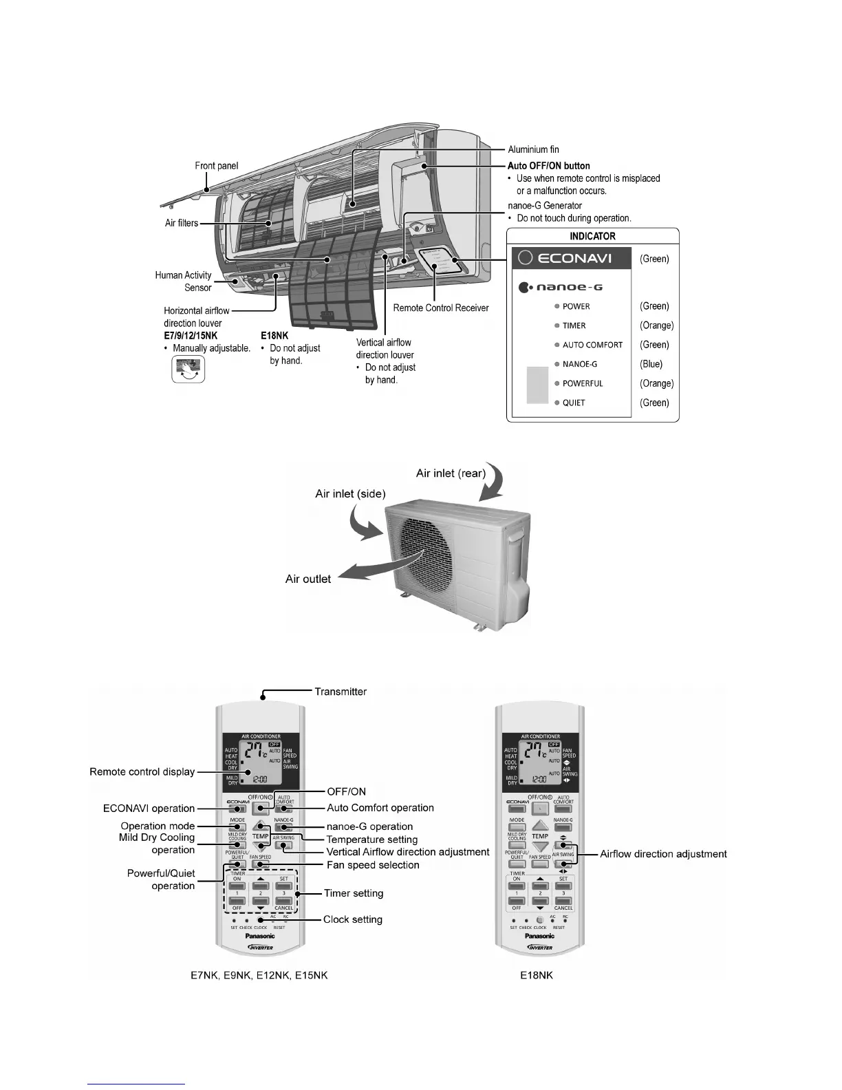 Panasonic CS-E12NKDW - Location of Controls and Components; Indoor Unit Controls and Components; Outdoor Unit Components; Remote Control Layout