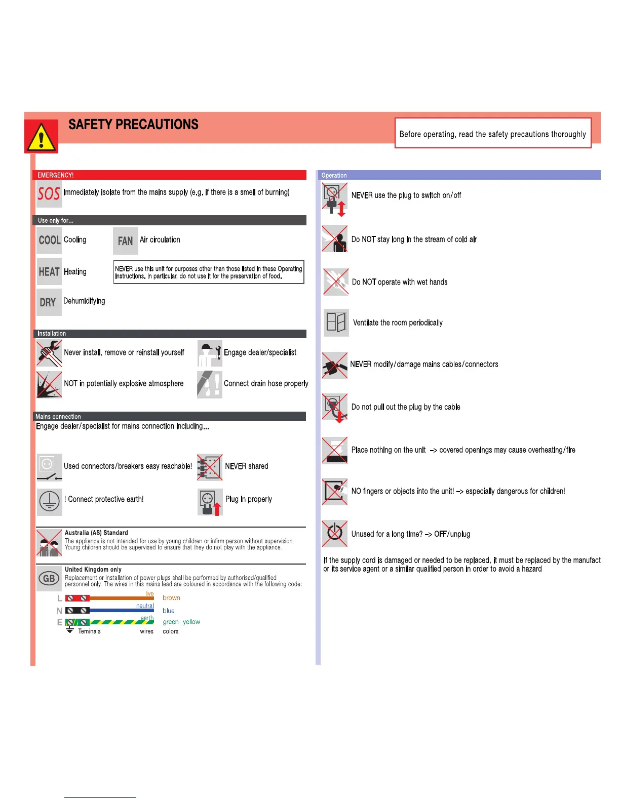 Panasonic CS-E15CKP - Safety Precautions and Warnings; Emergency Procedures; General Operation Safety; Installation Safety