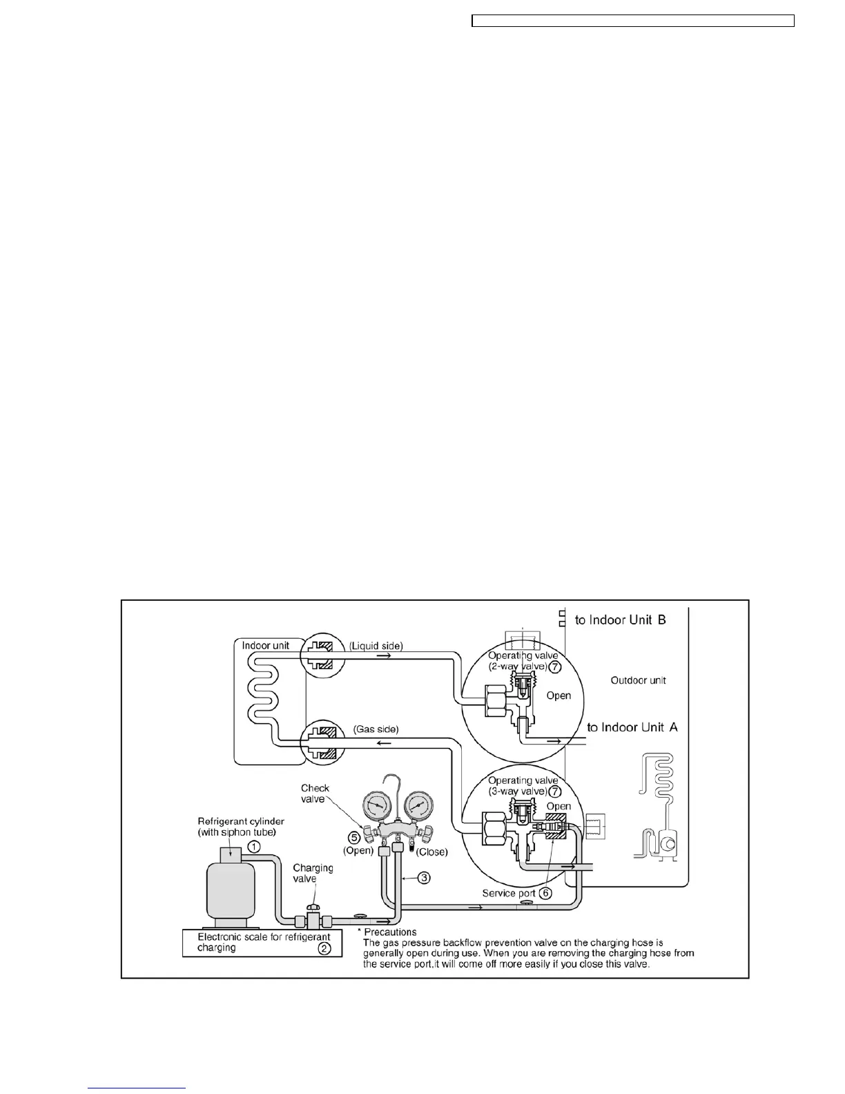 Never use the gas side to allow a larger amount of liquid refrigerant to be charged while operating the unit.