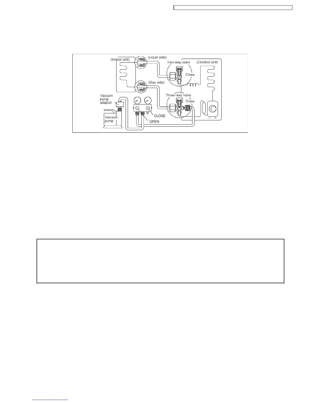 WHEN INSTALLING AN AIR CONDITIONER, BE SURE TO EVACUATE THE AIR INSIDE THE INDOOR UNIT AND PIPES in the