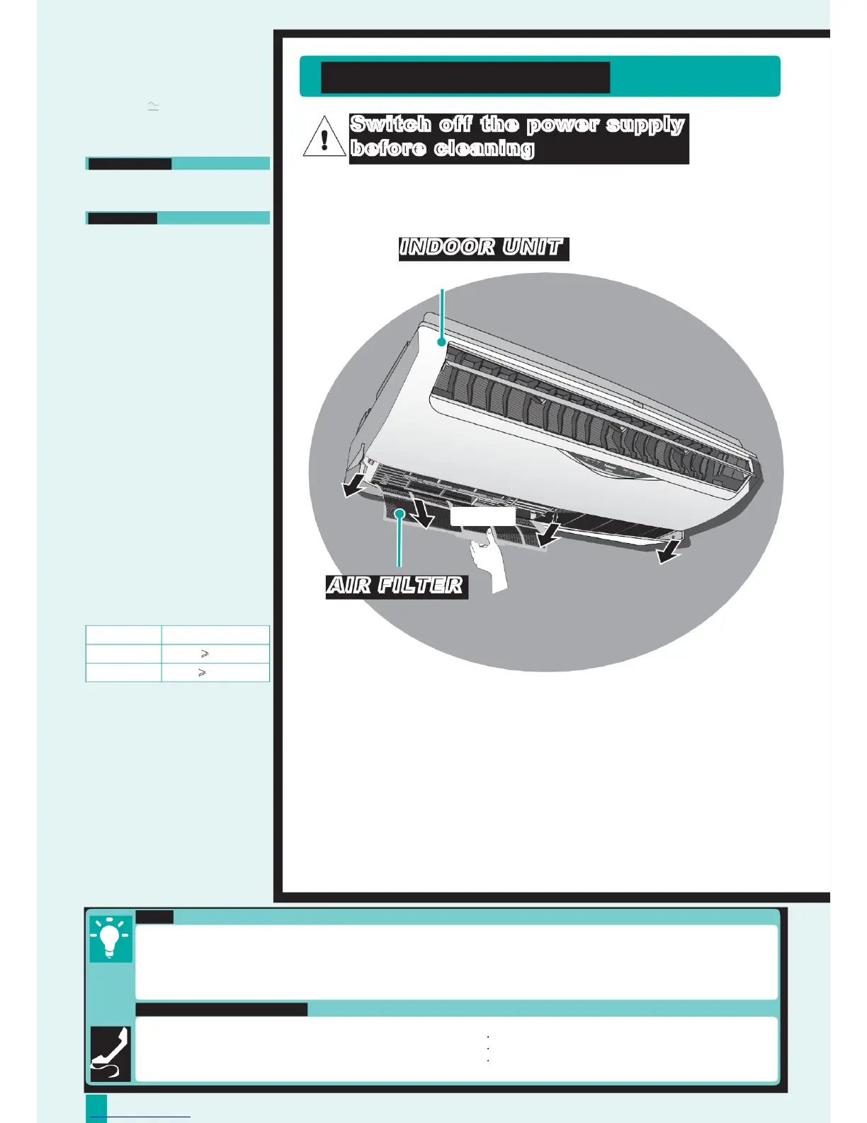 Clean the filter regularly as dirty filters will cause unpurified air, low cooling or heating capacity, unpleasant smells and higher
