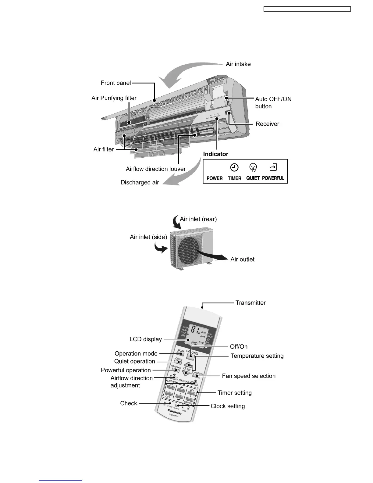 Panasonic CS-E18EKU - 3 Location of Controls and Components; Indoor Unit; Outdoor Unit; Remote Control