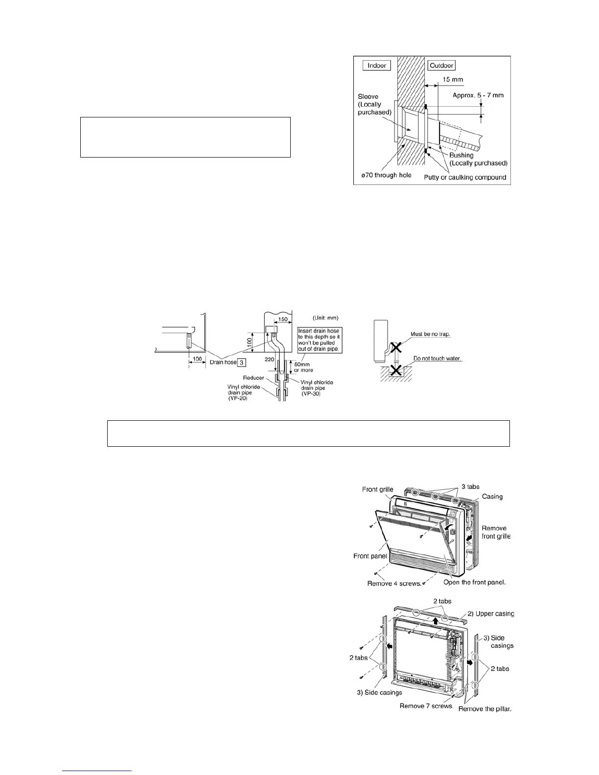5. Insulate the indoor drain pipe with 10mm or more of insulation material to prevent condensation.