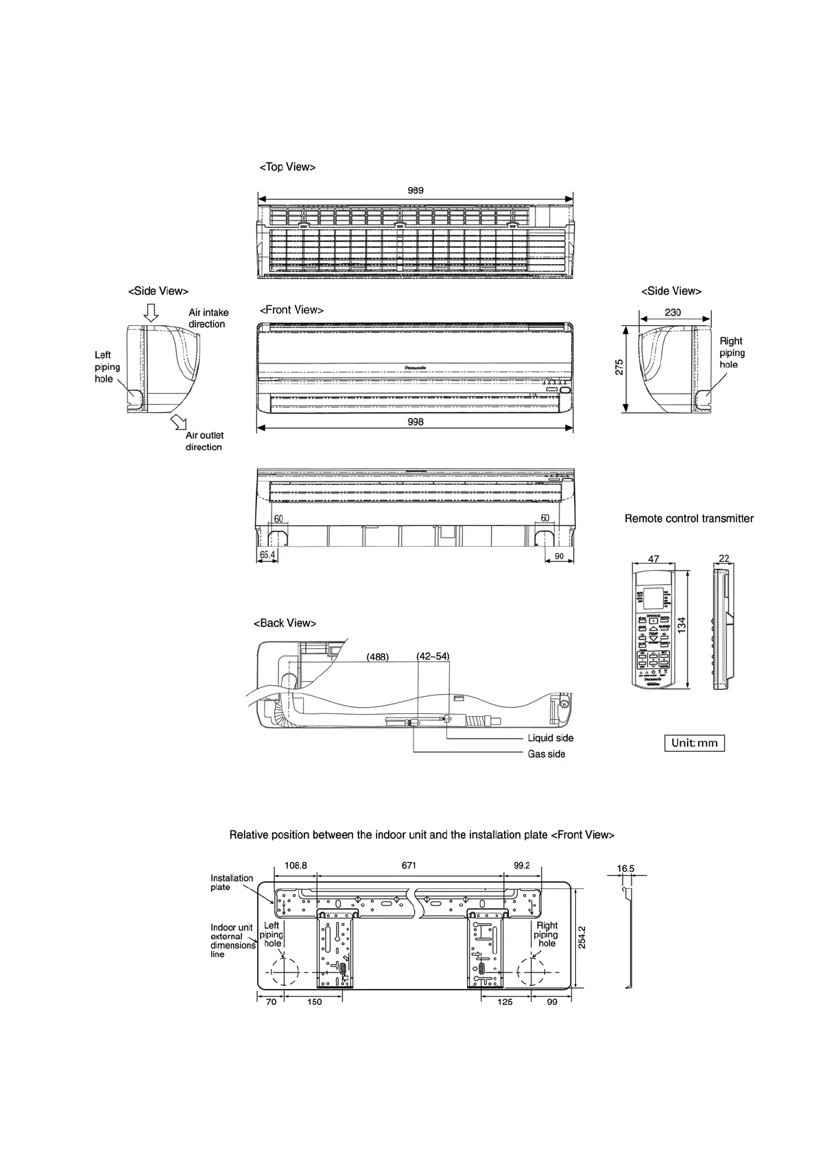 Panasonic CS-E18HKEW - Dimensions; Indoor Unit & Remote Control